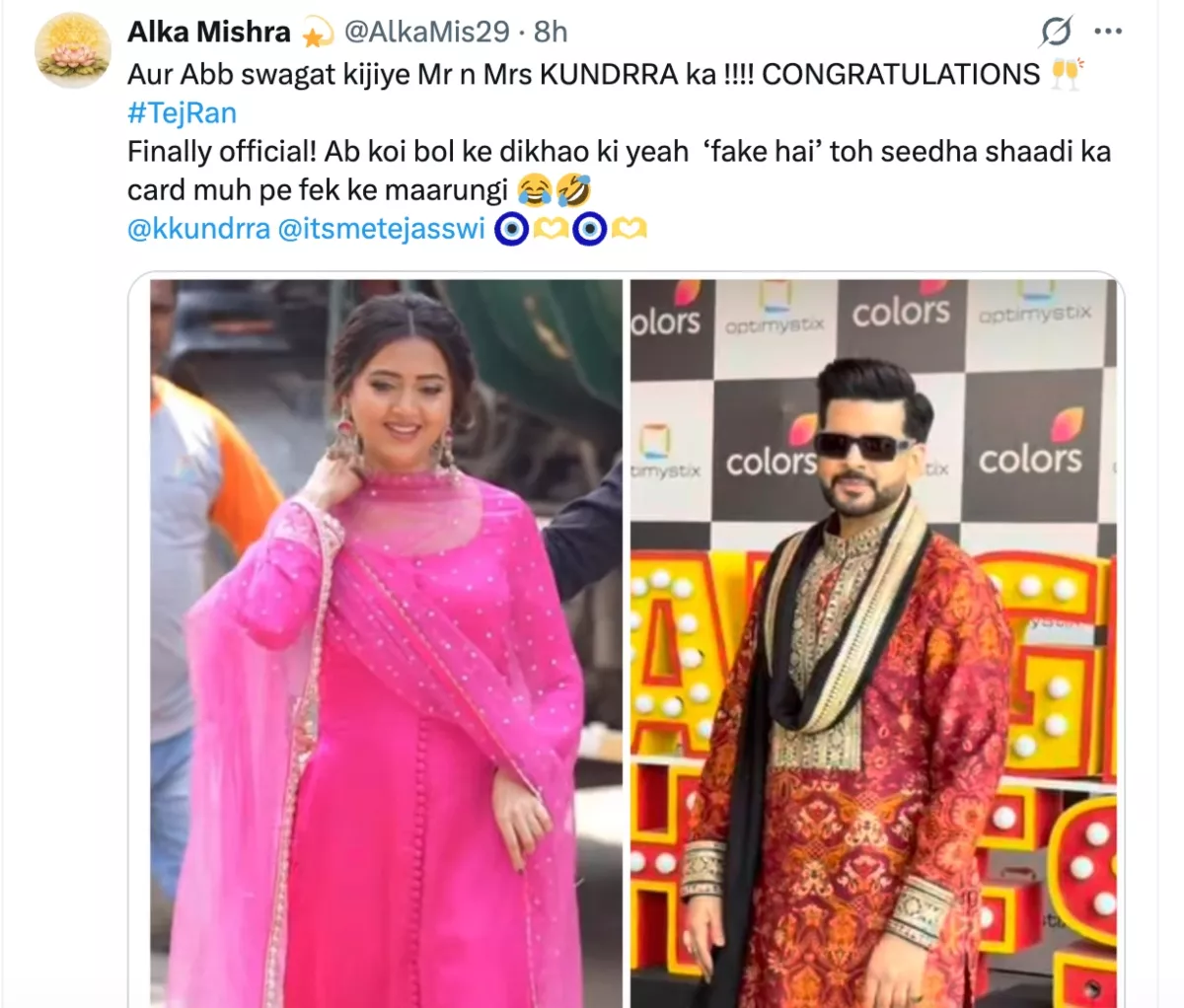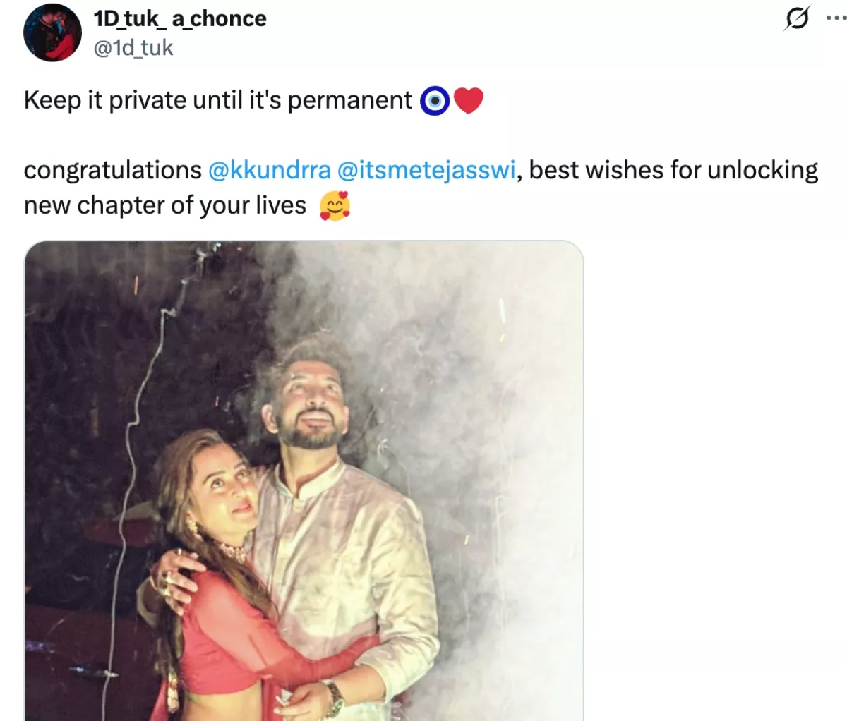 एक्स (पूर्व में ट्विटर) पर एक वायरल पोस्ट के बाद करण कुंद्रा और तेजस्वी प्रकाश की खबरें प्रसारित होने लगीं, जिसमें संकेत दिया गया था कि इस जोड़े ने गुप्त रूप से शादी कर ली है। हालाँकि, उनकी शादी के बारे में अभी तक कोई जानकारी नहीं है। लेकिन कई यूजर्स अपने-अपने एक्स हैंडल पर जाकर स्टार जोड़ी को बधाई देने लगे। एक यूजर ने लिखा, “इसे स्थायी होने तक निजी रखें। बधाई @kkundrra @itsmetejasswi, आपके जीवन का एक नया अध्याय खोलने के लिए शुभकामनाएं,” एक अन्य ने उनकी तस्वीर साझा की और लिखा, “बधाई हो।”