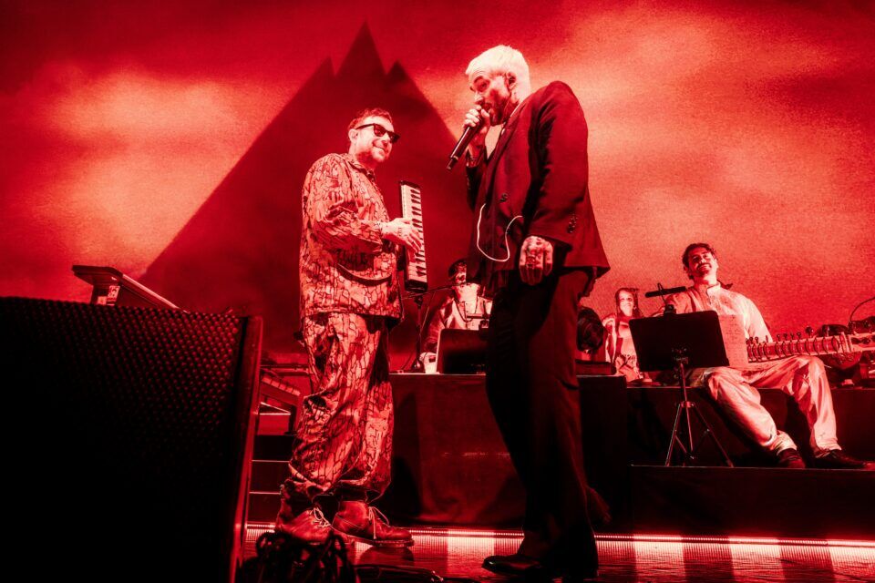 फरवरी 2026 में अमेरिका के लॉस एंजिल्स में पैलेडियम में IDLES गायक जो टैलबोट के साथ मंच पर गोरिल्लाज़ के सह-संस्थापक डेमन एल्बरन। फोटो: पूनेह घाना