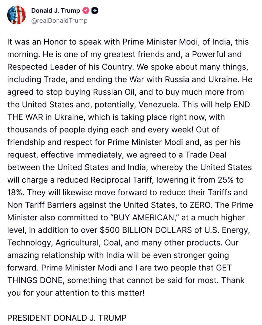 घोषणा ट्रुथ सोशल पर की गई थी, जहां अमेरिकी राष्ट्रपति ट्रम्प ने यह भी उल्लेख किया था कि भारत अमेरिकी उत्पादों पर टैरिफ और गैर-टैरिफ को घटाकर ‘शून्य’ कर देगा, और प्रधान मंत्री मोदी भी उच्च स्तर पर ‘बाय अमेरिकन’ पर सहमत हुए।