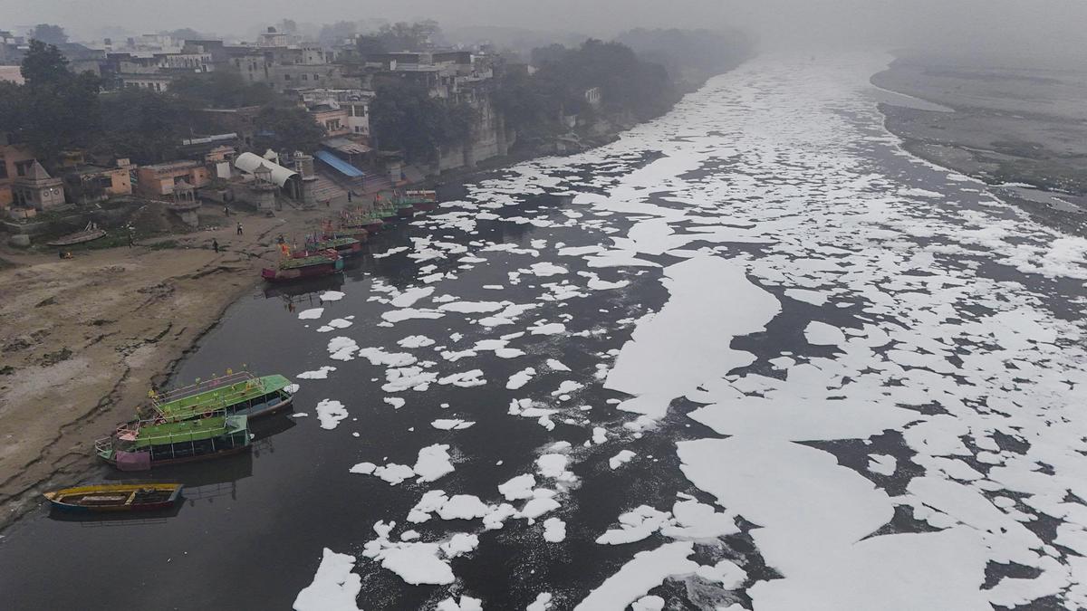 मथुरा के निकट यमुना नदी की सतह पर जहरीला झाग तैर रहा है। फ़ाइल