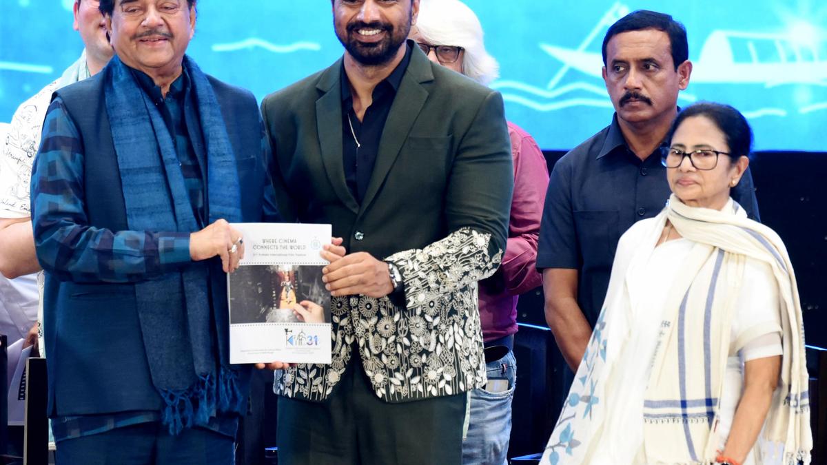6 नवंबर, 2025 को कोलकाता में 31वें अंतर्राष्ट्रीय फिल्म महोत्सव के दौरान पश्चिम बंगाल की मुख्यमंत्री ममता बनर्जी और शत्रुघ्न सिन्हा | फोटो क्रेडिट: एएनआई