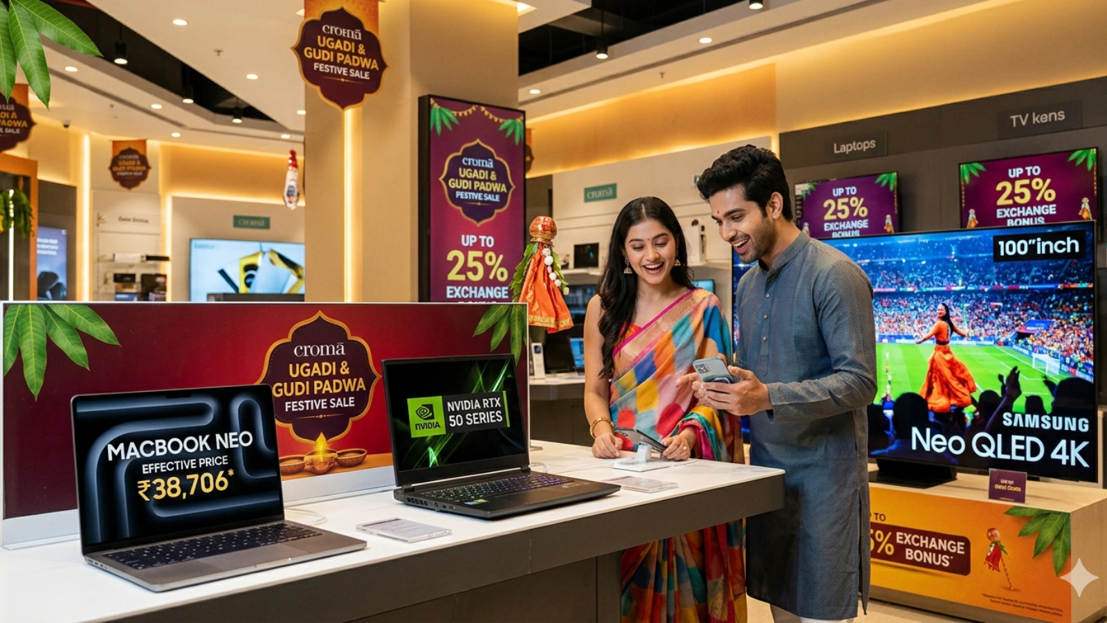 टाटा के स्वामित्व वाले इलेक्ट्रॉनिक्स रिटेलर क्रोमा ने अपनी उगादी और गुड़ी पड़वा उत्सव बिक्री की घोषणा की है, जिसमें लैपटॉप, टीवी और घरेलू उपकरणों सहित उत्पादों की एक विस्तृत श्रृंखला पर सौदे की पेशकश की गई है। यह सेल 19 मार्च से शुरू हुई और 31 मार्च तक चलेगी।