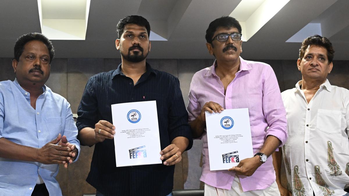 केरल फिल्म प्रोड्यूसर्स एसोसिएशन के सचिव लिस्टिन स्टीफन और फिल्म एम्प्लॉइज फेडरेशन ऑफ केरल के महासचिव बी. उन्नीकृष्णन ने सोमवार को कोच्चि में फिल्म श्रमिकों की सेवा शर्तों में संशोधन पर समझौता किया। | फोटो साभार: एच. विभु